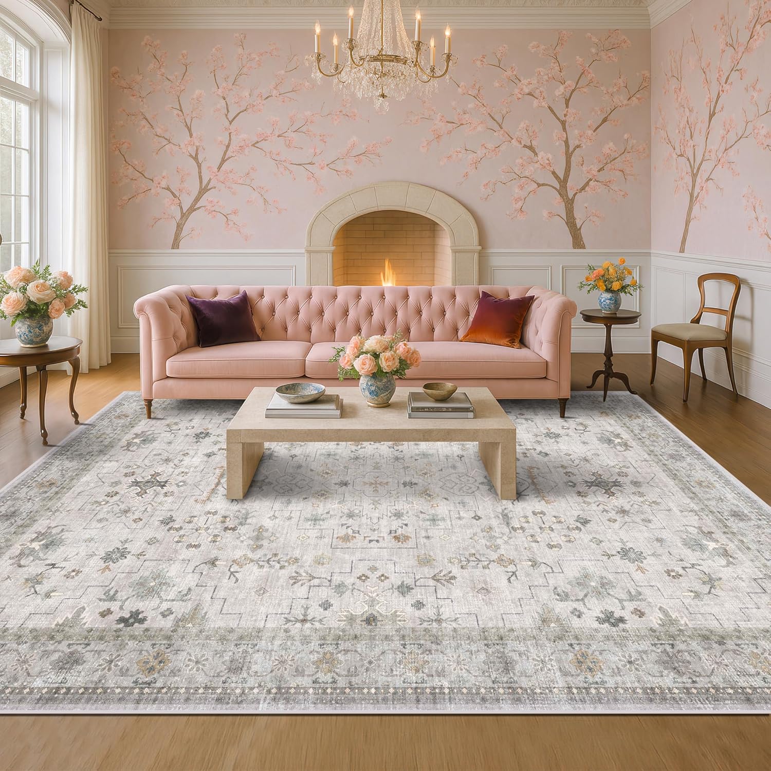 Green Area Rugs 9x12 Living Room - Washable Oriental Geometric, Extra Large for Bedroom Non Slip Soft Faux Wool Carpet for Dining Room Playroom, Lounge - Blue and Green Floral Rug
